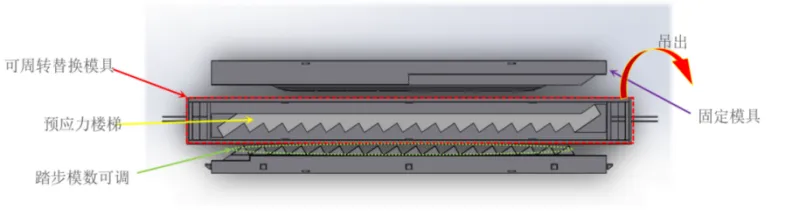 Передовой процесс производства самонесущих вертикальных форм с предварительным напряжением, разработанный компанией Zhubang Technology, отделяет самонесущие вертикальные формы с предварительным напряжением от боковых форм для лестниц. Один набор боковых форм может быть соединен с несколькими самонесущими вертикальными формами, что эффективно повышает эффективность оборота форм, увеличивает объем производства и снижает затраты на амортизацию форм. Благодаря регулируемой модульной конструкции один комплект форм может использоваться для производства лестниц различных спецификаций. В настоящее время формы подразделяются на однопролетные, двухпролетные и многопролетные лестничные версии.