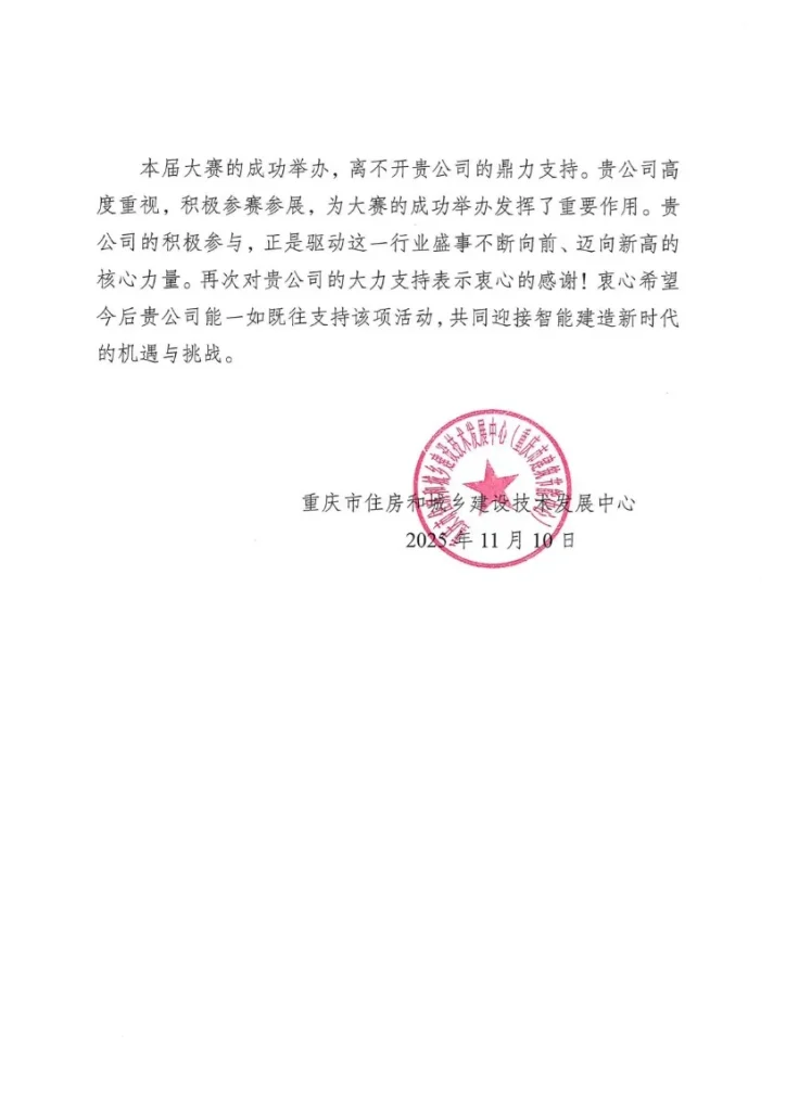 Недавно Чжубанг Строительные Технологии получила благодарственное письмо от Центра развития технологий жилищного строительства и городского-сельского развития Чунцина. В письме выражалась благодарность за существенную поддержку, оказанную Чжубанг Строительные Технологии во время третьего национального конкурса и выставки по интеллектуальному строительству и строительной робототехнике под лозунгом «Интеллектуальное строительство · Делимся будущим». В письме высоко оценивалась активная роль компании в продвижении развития интеллектуальной строительной отрасли. Этот обнадеживающий жест не только демонстрирует признание и уважение регулирующего органа к вкладу компании, но и укрепляет ее уверенность и мотивацию продолжать инвестировать в технологические инновации. Он еще больше усиливает сплоченность между правительством и предприятиями в совместном продвижении прогресса в отрасли.